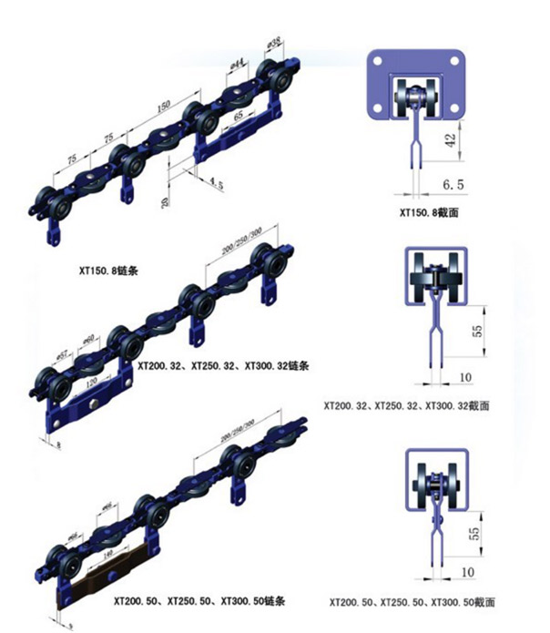 軌道采用開口方鋼管制造,具有外型美觀,運動部件不外露等特點,除了提高鏈條本身的防塵、防污性能外,同時也減小了因偶然事件造成的觸及、刮破鏈條等故障,加強了安全性。